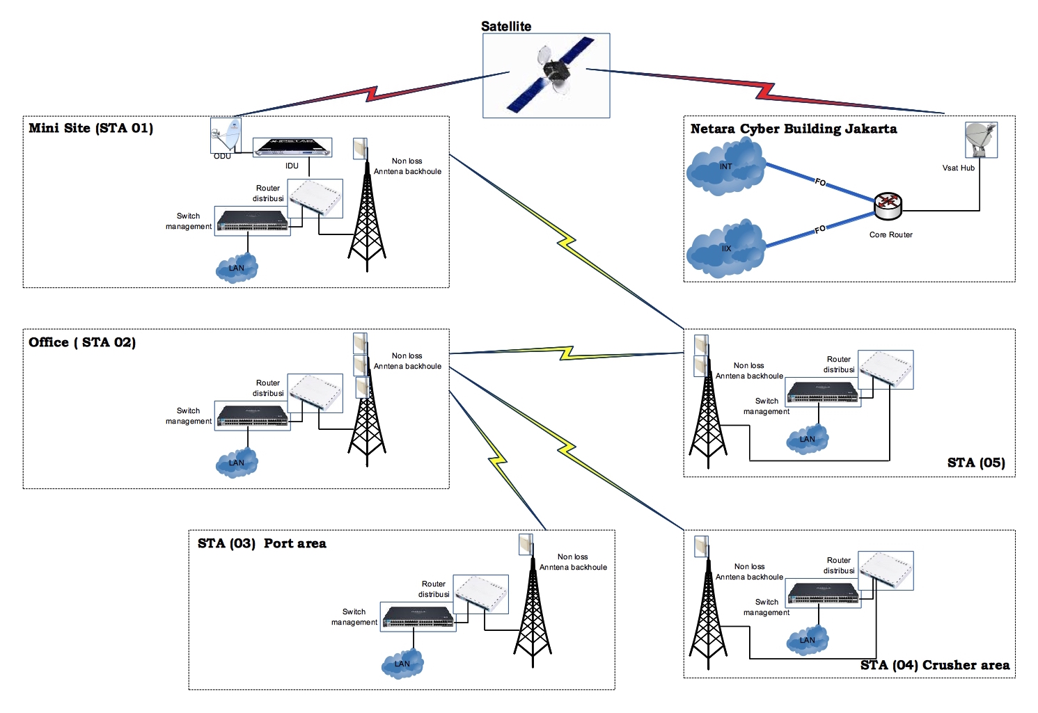 Sejak tahap eksplorasi, perusahaan X ini membutuhkan sistem pendukung transaksi data dan informasi yang tinggi. Pengolahan data teknis maupun non-teknis mengharuskan kemampuan transfer yang cepat, sehingga pertimbangan komersial dapat dilakukan dengan efektif untuk memasuki tahap eksploitasi. Oleh karena itu, solusi IT yang efektif dan efisien dikembangkan untuk mendukung kinerja di dalam perkantoran, baik di pusat maupun cabang. Selain itu, teknologi komunikasi dengan lokasi-lokasi pertambangan, transit bahkan pelabuhan harus dipersiapkan sejak dini. Berikut ini beberapa topologi dan diagram yang dikembangkan bersama antara NETARA dan perusahaan X, sebagai jawaban akan kebutuhan solusi IT yang ekonomis namun tetap memperhitungkan kepentingan jangka panjang demi kelangsungan operasional dan bisnis.